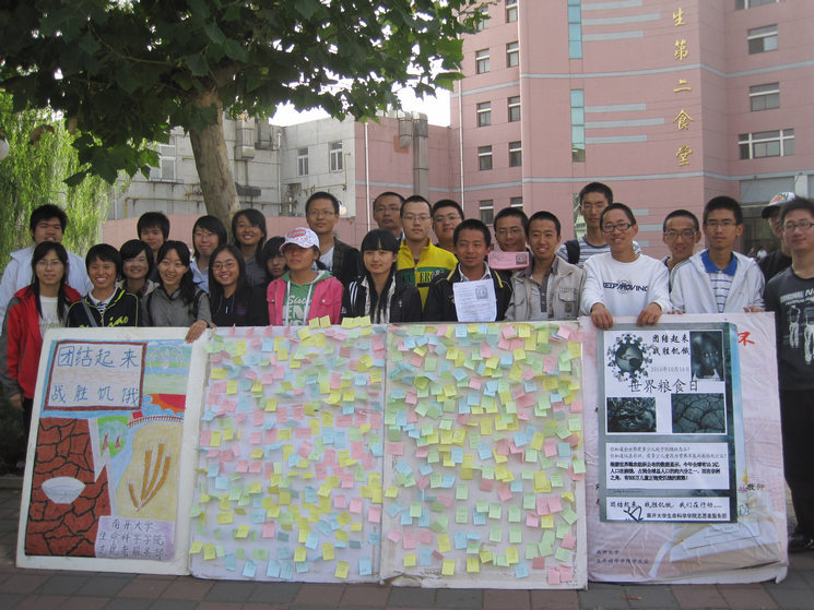 2010年10月15日至16日,yl7703永利集团志愿者服务与实践中心在二食堂门口组织了以“团结起来,战胜饥饿”为主题的世界粮食日宣传活动。