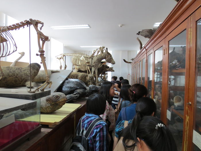 两位老师首先带领两个小班的同学参观了四教的动物标本室。动物标本室里陈列着数百种保存完好的动物标本,有正在求偶开屏的孔雀、展翅飞翔的蝙蝠、凶猛的猎豹、可爱的兔子等等。每个标本都有详细的解说介绍。2011级的同学已经学过动物学,所以2011级的同学向2012级的同学分享了她们学习动物学的经验,在交流的过程中学习了许多动物的知识,激发了同学们学习生命科学的兴趣。