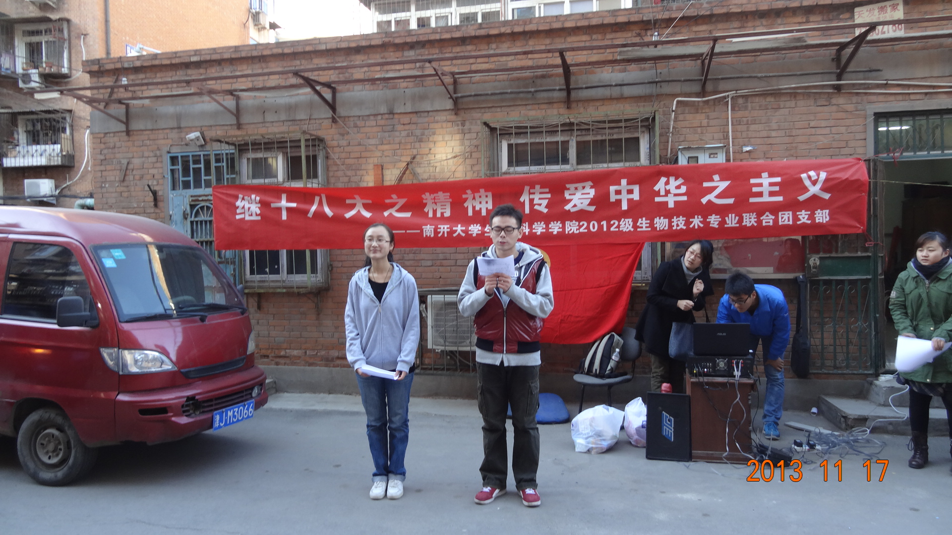 11月17日下午,yl7703永利集团2012级生物技术专业联合团支部全体成员赴天津市南开区同富里社区,开展了“继十八大之精神,传爱中华之主义”主题团日活动。通过宣讲、表演、交流互动等方式,与社区居民一同深入学习了十八大精神,并将对十八届三中全会的“全面深化改革”的领悟传递给社区居民。