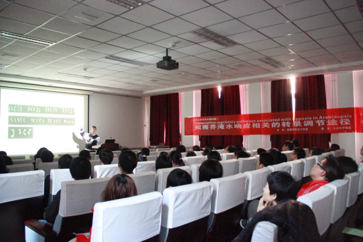 涝害是严重影响作物产量的一种自然灾害。施明哲教授的报告围绕植物受到水淹胁迫后的一系列转录调控开展,以story的形式生动而有趣的阐释了模式植物拟南芥中两个典型的转录因子AtHRE1和WRKY22在植物受到淹水胁迫后对维持植物生存所起到的一系列调节作用的分子机制,以期为应用分子生物学手段来改良农作物的抗涝性奠定重要的前期研究基础。
