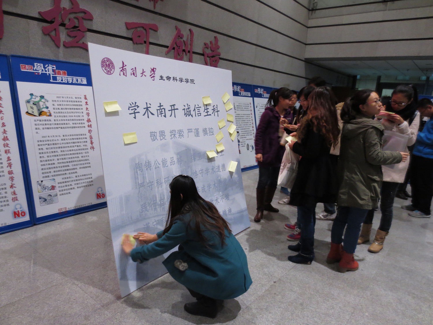 宣誓结束后,每位同学都怀揣敬畏之心在纸上写下了自己的“诚信誓言”,郑重地把它们贴在了展板上,向母校、向社会做出了一名属于南开生科人的庄严承诺。