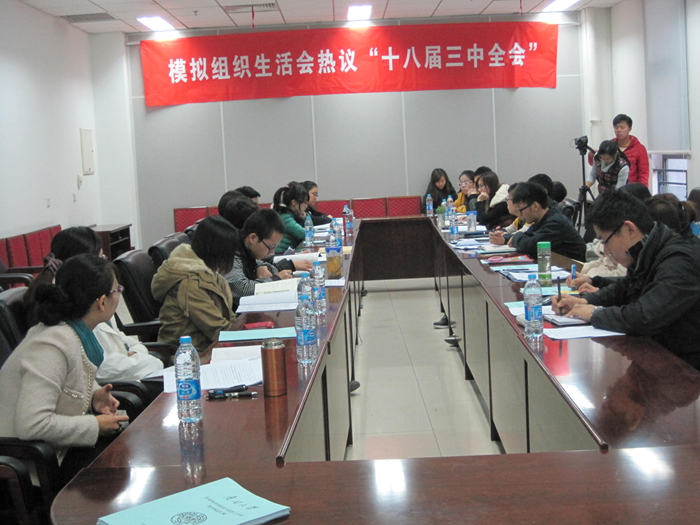 会议围绕学习党的十八届三中全会精神展开,采用模拟组织生活会的形式,首先由2010级硕士第四党支部书记马超同学简要回顾了历届三中全会的主题,并简要介绍了十八届三中全会的主要内容。随后,各位学生党支部书记踊跃发言,针对全会起草的《中共中央关于全面深化改革若干重大问题的决定》和《中国共产党第十八届中央委员会第三次全体会议公报》,结合自己专业知识、成长经历和实践活动等畅谈了学习心得,其中张宏思同学提出了十八届三中全会和历届三中全会的不同,她说,十八届三中全会提出的“改革”是系统的、并且有详细规划的,而且体现了对历史文化的传承,从中可以看出新一届国家领导人改革的决心和力度,作为当代大学生党员,要有这种使命感和责任感,认真学习,发挥党员辐射作用,传递正能量。陈薇同学结合自己的专业知识,希望在改革中加强环境问题的解决,在促进经济改革的同时应该加大环境保护力度。卢作�同学提出“劳教”制度的废除是一个很好的起点,相信我国法制规范化的进程会不断加强。与会同学就社会公正、市场经济、城乡建设等各个方面进行了讨论。会场气氛活跃,大家积极发言,充分显示了大学生的参政议政能力。模拟生活会的最后,王兰老师在总结中提到:全会颁布的总体改革方案,将是化解社会矛盾、推动经济发展的风向标。但是,改革的路一条充满险阻挑战的荆棘之路,需要国家领导人的勇气与智慧,同时也需要全社会的共同努力,作为学生党员干部,要有责任感和使命感,要加强十八届三中全会精神的学习和宣传,为日后成为改革的中坚力量而努力。