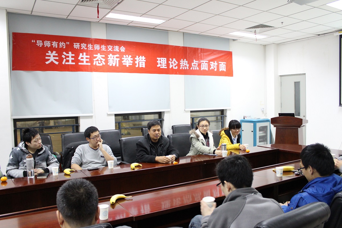 12月11日晚,生物站A110会议室内气氛轻松热烈,欢声笑语不断。由生科院硕士第一党支部举办的“理论热点面对面,关注生态新举措”导师有约师生座谈会在这里举行,师生共话环保新举措。会议由硕士第一党支部书记陈薇主持,2013级硕士生赵瑞瑞同学担任主讲人,植物学专业教授、博士生导师石福臣老师担任嘉宾出席活动。