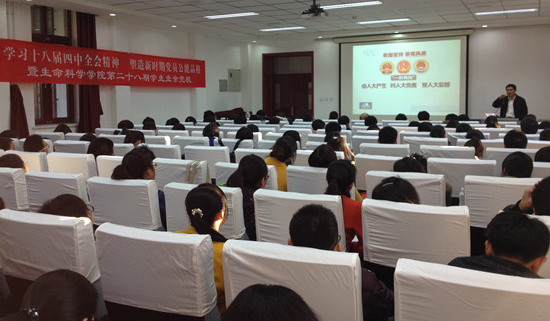 (记者 马超)为全面准确学习领会党的十八届四中全会精神,yl7703永利集团党委于11月14日举办专题学习报告会,邀请全国党的建设研究会特邀研究员、校党委宣传部副部长、马克思主义教育学院副教授张健,围绕党的十八届四中全会通过的《中共中央关于全面推进依法治国若干重大问题的决定》,从学习研读方法、制定出台背景、主要内容把握以及如何结合实际贯彻落实四个方面,为全院师生党员进行了讲解。院党委书记吴秀英及院系有关负责人出席报告会,院党委副书记、副院长李营主持了报告会。