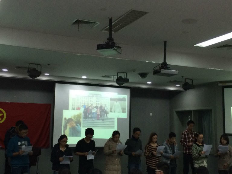 在各组毕业汇演环节,本期团校的点点滴滴再次浮现在观众面前,素拓、废物利用大赛、知识竞赛、辩论赛、方言短剧大赛等等。这里,有对雾霾的无奈,有对浴园关停的“愤慨”,有宿舍床铺上的聊天,也有模仿老师口吻的“语录”。有的用寓言故事表达不舍,有的用朗诵表达回忆,有的用视频来分享经历,有的用舞蹈表达欢笑。既有慷慨激昂的朗诵,也有美妙悦耳的歌声。从军训场上到团校之中,过去几个月的时光,一瞬间展现在观众的眼前。