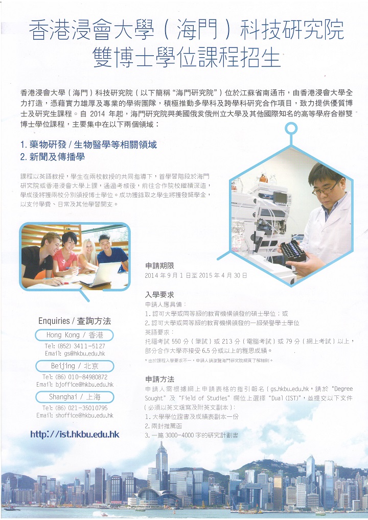 下方图片为香港浸会大学科技研究院招生的宣传页扫描件,感兴趣的同学可到生物站A103-2鲍文海老师处领取完整的宣传材料。