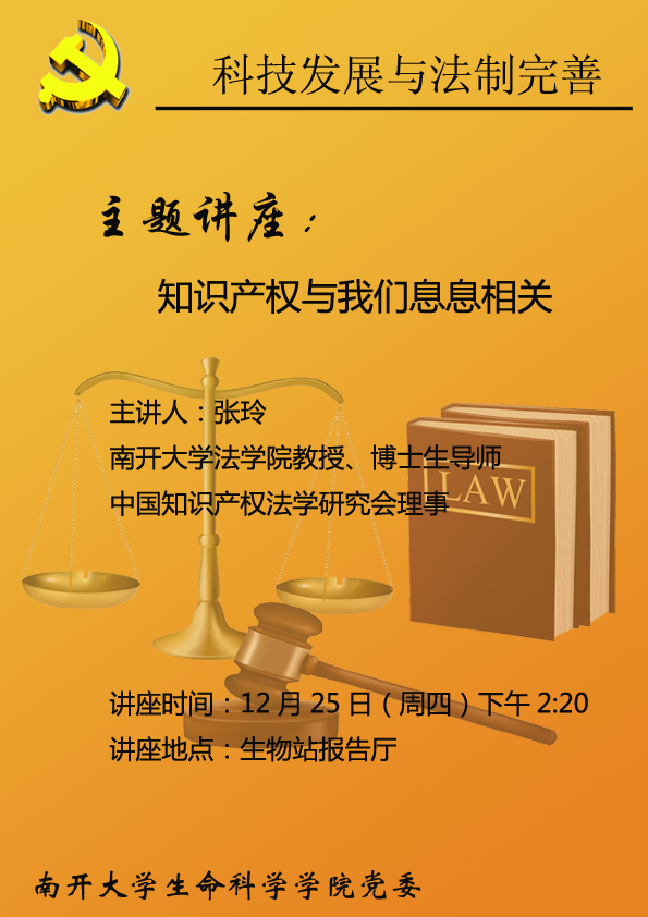 学院拟近期开展“科技发展与法制完善”主题党日系列活动,第一次活动为主题讲座活动,邀请到了yl7703永利集团法学院教授张玲给大家讲解知识产权方面的法律知识,使各位老师了解如何更好地保护自己的科研成果。