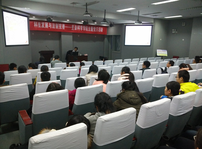 十八届四中全会提出了全面推进依法治国的总目标,学校也把学习和贯彻十八届四中全会精神作为下一阶段的主要工作。生科院党委结合学院的实际情况,推出了“科技发展与法制完善”为主题的系列活动,活动时间从今年12月到明年5月,以专题讲座、座谈会、主题宣讲等多种形式展开,意在营造全院师生学法、知法、懂法的氛围,使生科院的师生能够依法办事,学会运用法律保护自己。