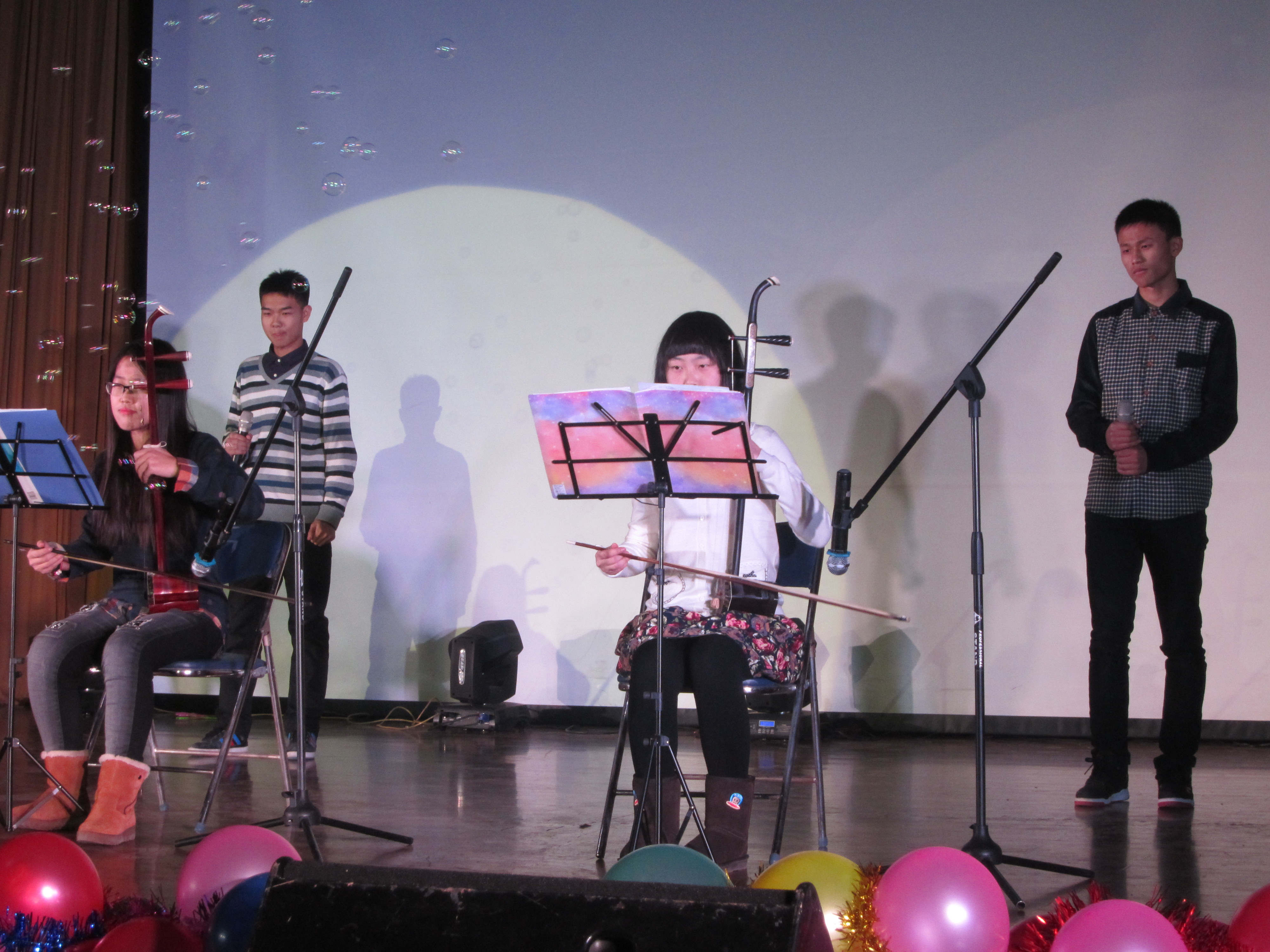 欢乐过后,温情不断。生科院14级新生朱子坤、佟鑫等带来联唱《爱的四季》。变换的灯光,浪漫的气泡,演员们通过演绎恋爱中不同时期的歌曲带领大家感受爱的风霜雨雪。二胡淡淡的旋律,撞上《烟花易冷》、《青花瓷》等中国风的歌曲,曼妙优美的旋律,听来身临其境,撕心裂肺。校园十大歌手人气之星周延博、张瑞玮如灵魂歌者般,安静的演绎了一曲《好好说再见》,男声稳重,清新中又带有一丝沧桑;女声细腻,犹如天籁,两者错综交叉,为大家讲述了一个动人的故事。《好好说再见》,怀着感恩之心告别2014,用热情的双手迎接充满希望的2015!