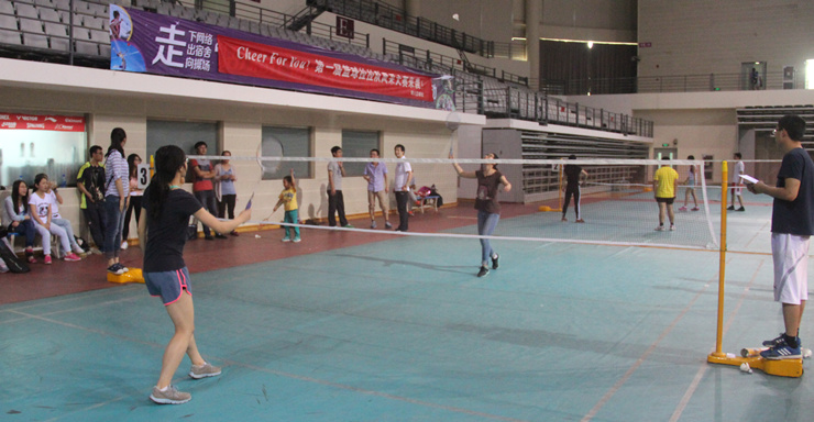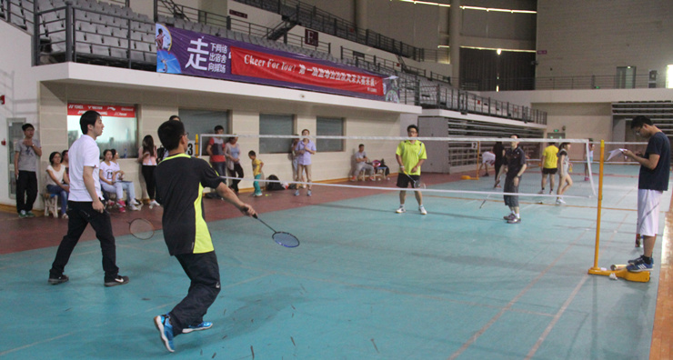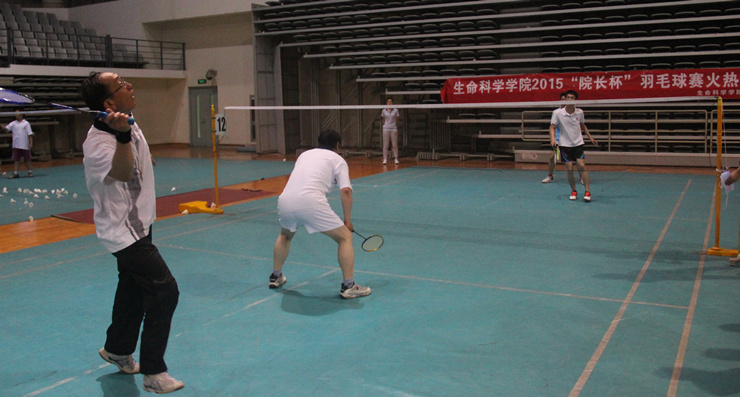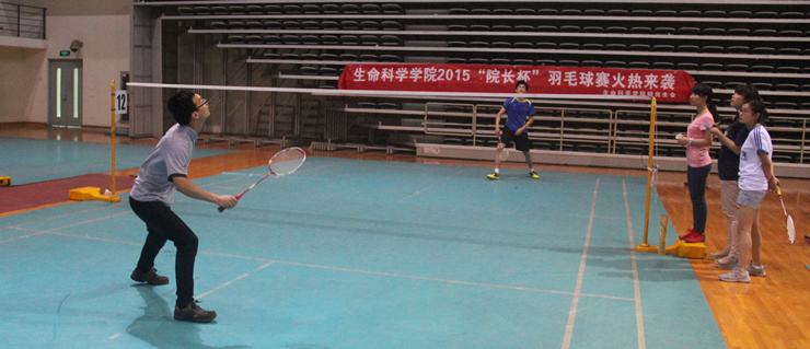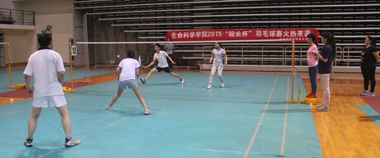 5月22日下午五点,“院长杯”羽毛球赛淘汰赛第一场在新体育馆正式点燃战火。对阵形势:“海兰藏獒队”VS“Dong Lab队”和“植物生态队”VS“羽球兄弟队”。