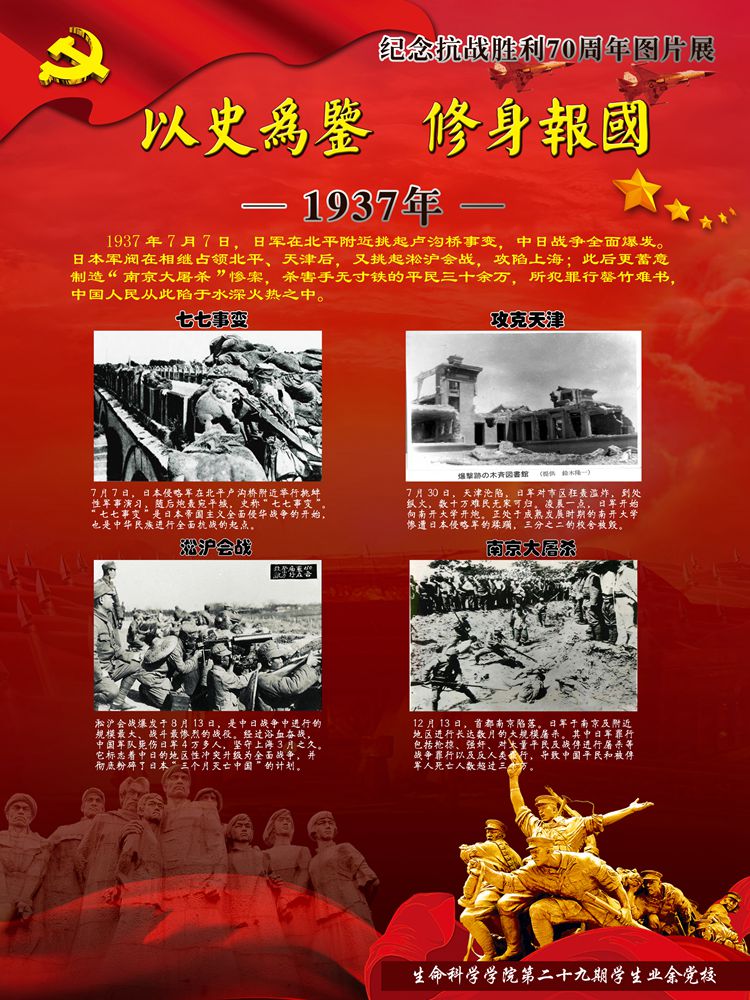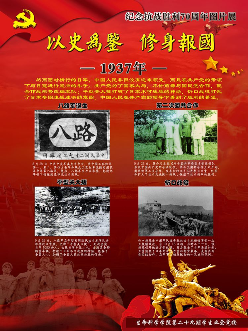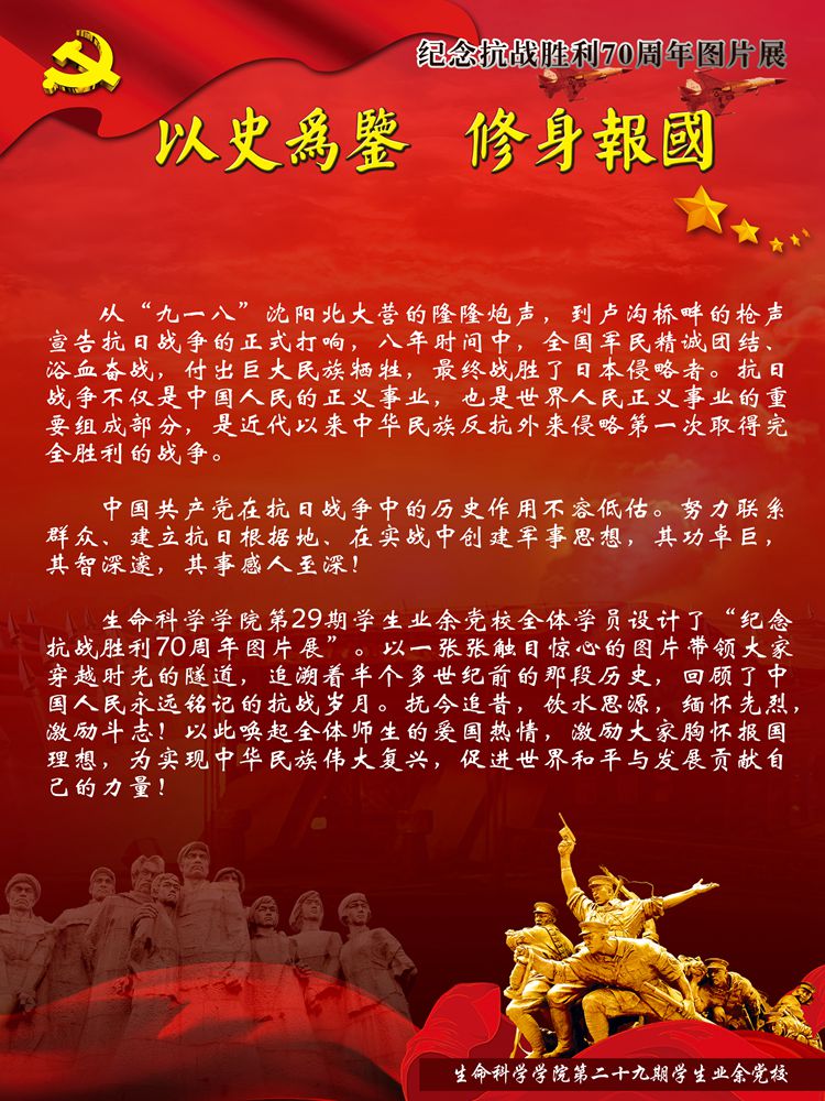 值此即将迎来党的94岁生日之际,yl7703永利集团生物站迎来了由yl7703永利集团学生设计制作的纪念抗战胜利70周年的图片展。