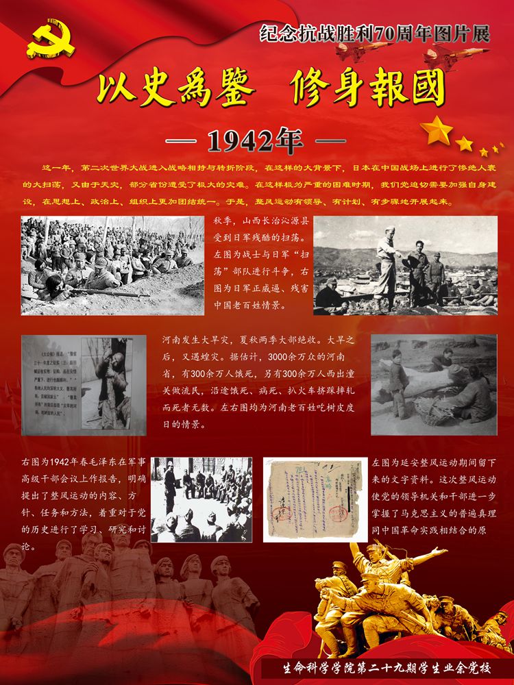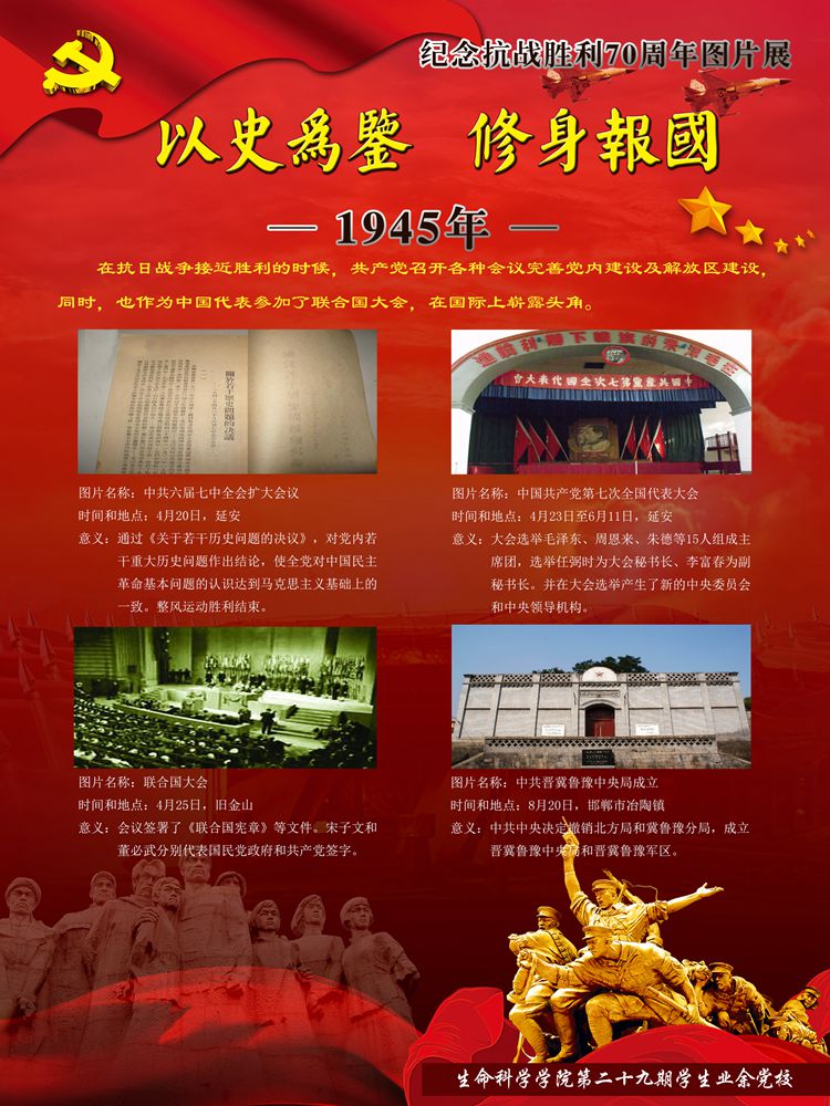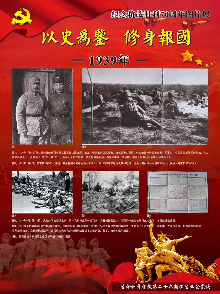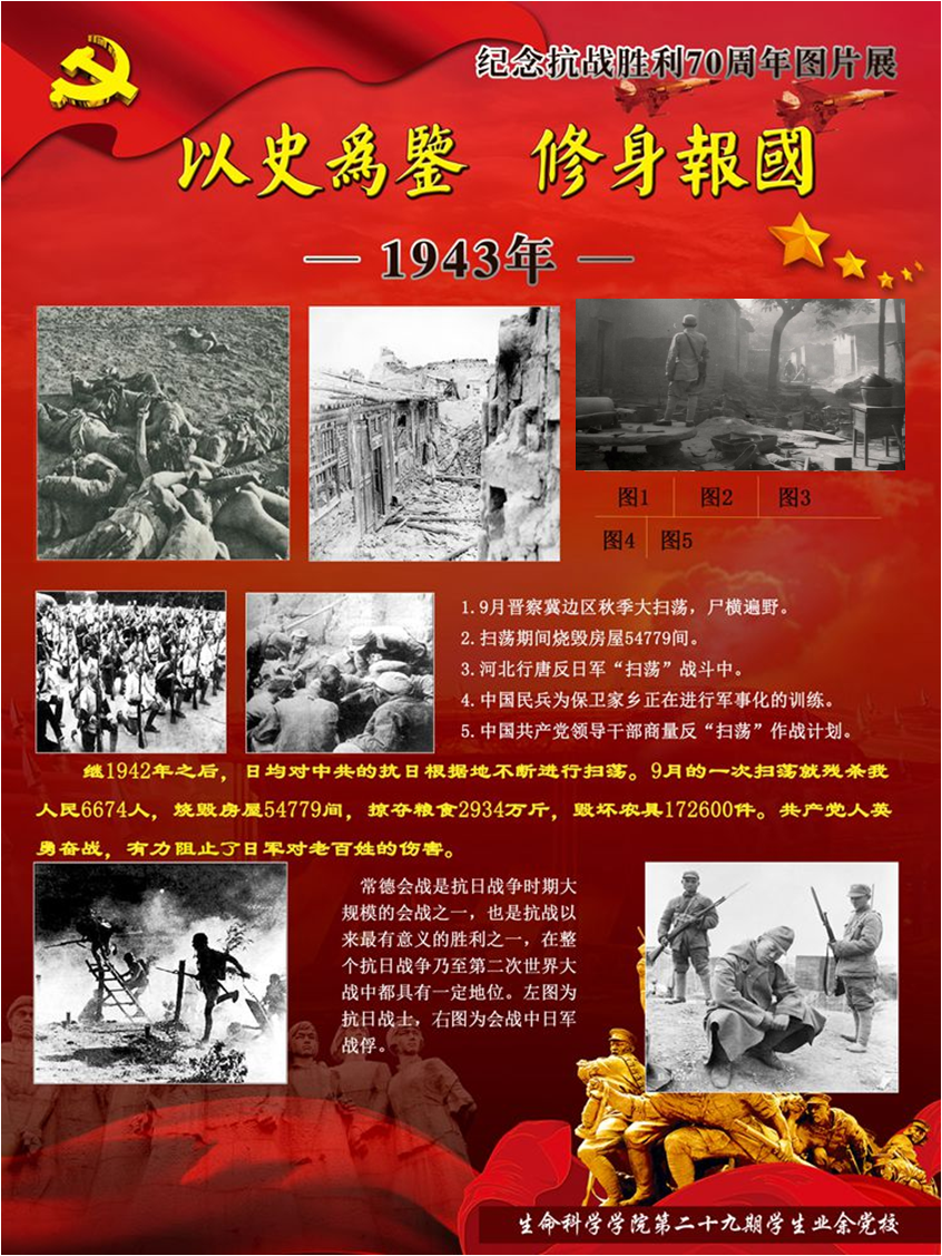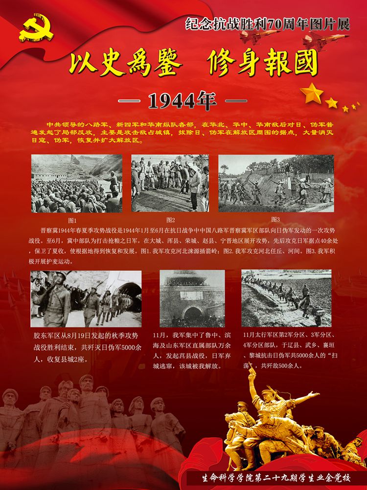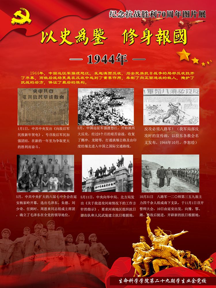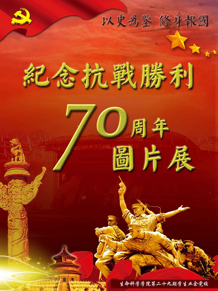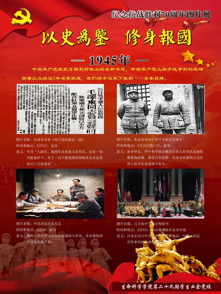 今年是世界反法西斯战争暨中国抗日战争胜利70周年。70年前中国人民经过八年艰苦卓绝的抗日战争,无数英勇军民身先士卒浴血奋战,最终取得了抗战的伟大胜利,为世界反法西斯战争的胜利做出了巨大贡献。70年后的今天虽然没有了硝烟四起的战争,但新时期青年不应该忘却那段历史,更不应该忘记那段历史中共产党人的巨大牺牲。因此yl7703永利集团学生业余党校制作了纪念抗战胜利70周年图片展,带领大家穿越时光的隧道,抚今追昔,饮水思源,缅怀先烈,激励斗志!