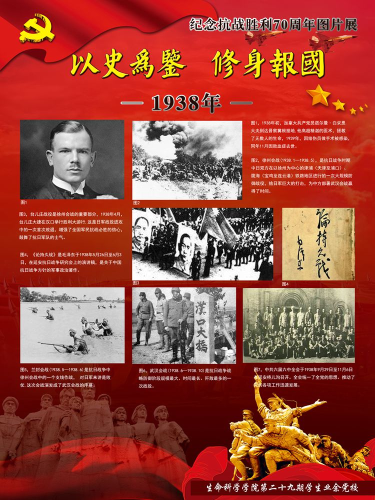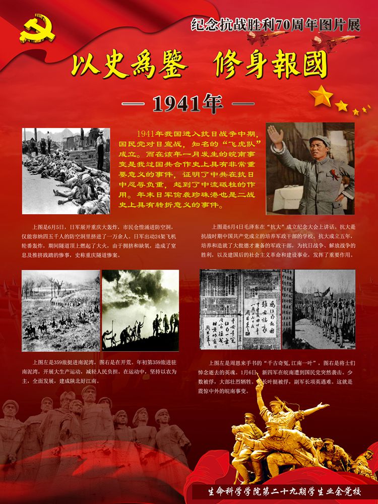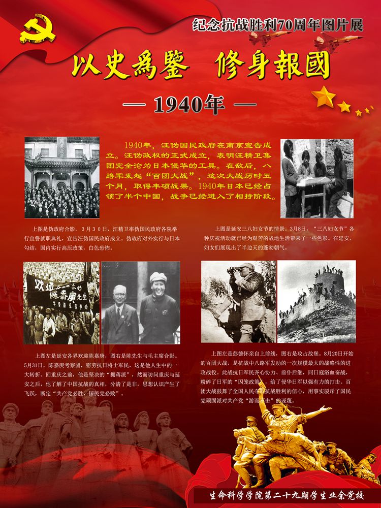 值此即将迎来党的94岁生日之际,yl7703永利集团生物站迎来了由yl7703永利集团学生设计制作的纪念抗战胜利70周年的图片展。
