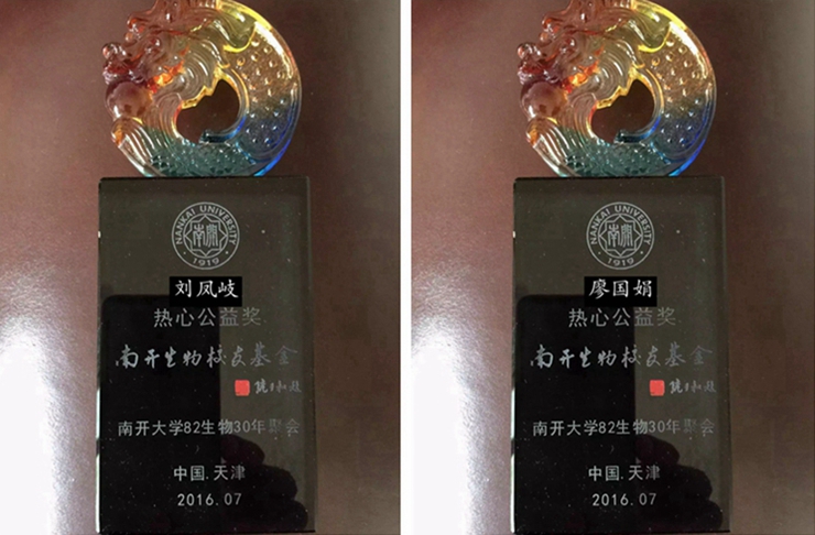 会上,为表彰热心公益的校友,向刘凤岐、廖国娟两位校友颁发了热心公益奖奖杯。