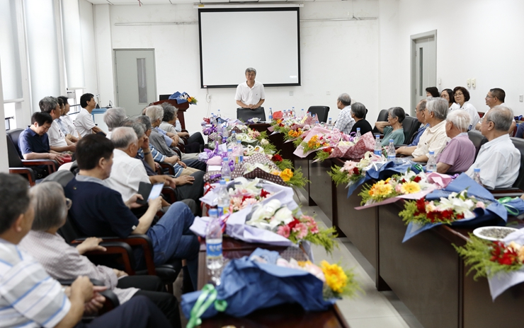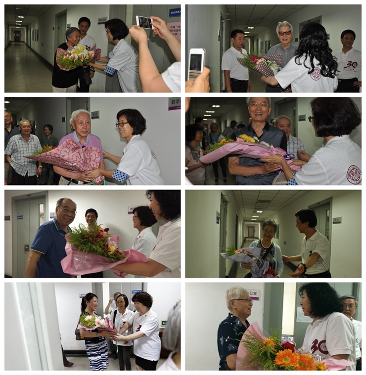 校友为老师们献花,花香扑鼻,令人心醉。他们自发地按专业介绍了自己的任课老师,前来参会的老师当中最年轻的也已经退休,但他们却能细说出当年的故事,其场景温暖着在场的每个人。