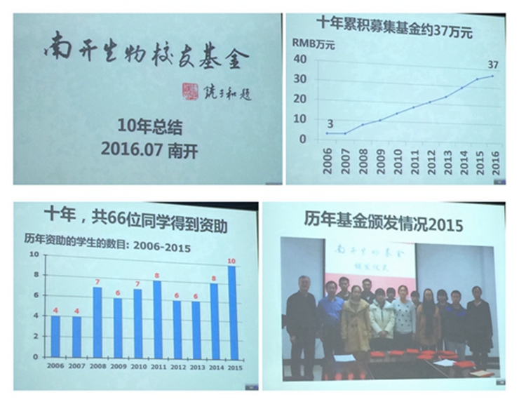 曾主任,卜院长分别致辞,欢迎校友回家,会上还介绍了82级校友捐赠情况,2006年,82级校友在毕业20周年之际发起捐赠活动,每年捐款资助在校贫困生。该基金于2008年9月19日由时任yl7703永利集团校长饶子和院士题词,正式命名为“南开生物基金”。如今,10年过去了,82级校友累计捐款30多万元(许多校友都是专门拿出部分工资坚持捐款),先后有66位生科院学子得到了“南开生物基金”的资助。10年的奉献,10年的坚持,此举令人赞叹不已!