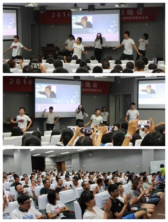 明亮的圆月高挂,欢乐的笑声飞扬。学长学姐们以一支活泼搞怪的舞蹈《咋啦?屯里人》开场,在轻松欢快的气氛中拉开了序幕。16级新生们也不甘示弱,以歌曲串烧热烈回应:一曲《小幸运》温柔深情,让全场观众入迷,动听的《Innocence》勾起了同学们的年少记忆,一首《三月雨》唱出别样的磅礴气势,男女对唱的《锦鲤抄》和《美丽的神话》悠扬动人,赢得掌声不断。更有“舞蹈天团”带来热舞《Roly Poly》引燃全场,将晚会推向高潮。