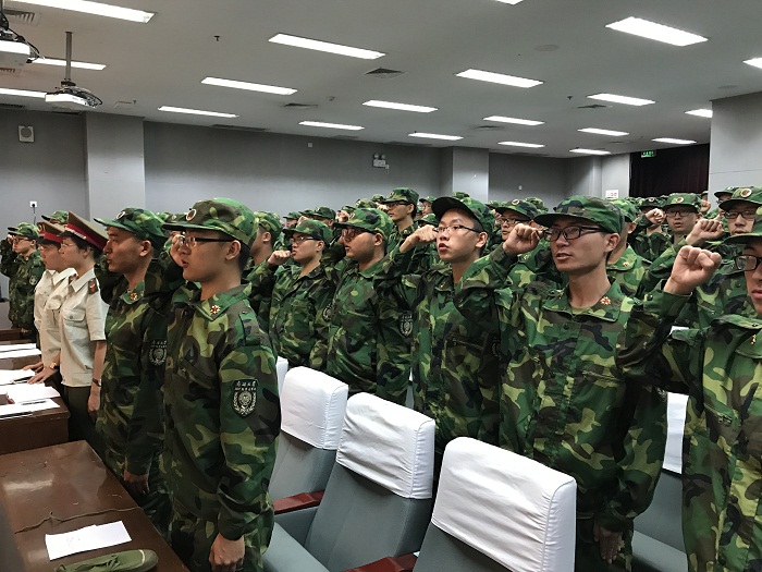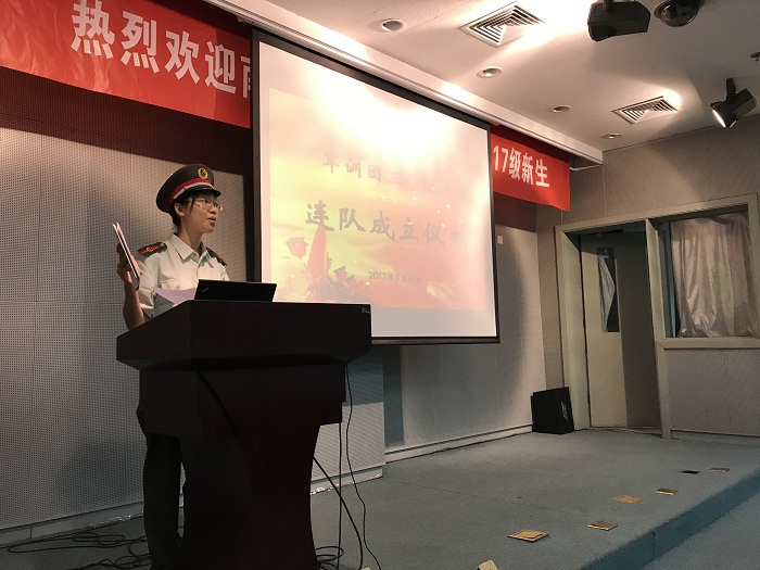 在成立仪式上,全体参训人员统一身着迷彩军装,英姿飒爽,整齐地端坐在座位上。奏唱国歌仪式后,指导员王一涵向同学们介绍连队情况,并任命了连队骨干。之后是庄严的连队大点名环节。被点到名字的同学都是立即起立站直,大声喊出“到!”相比于几天前,精神面貌已经大有改观。