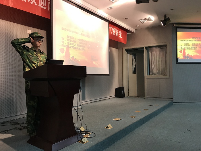 三排二班何明倩代表全体参训学生上台发言。何明倩强调了校训“允公允能,日新月异”对于培养军人精神的重要性,充分表达出了学员们服从命令、完成任务的心声。发言全体学生在何明倩的带领下庄严宣誓。同学们举起右拳,郑重承诺,以积极昂扬的风貌迎接未来十天的挑战。
