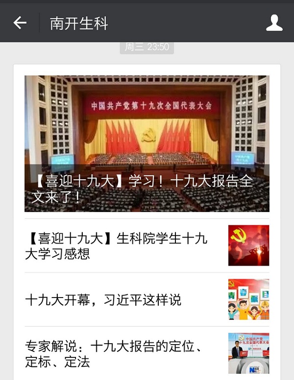 学院微信公众号“南开生科”近期推出了“喜迎十九大,生科在行动”系列专题推送,全方位报道了学院各班级、各党团支部、各学生组织为迎接十九大开展的系列活动。学院新媒体中心精心策划,推出了《中国共产党历次党代会回顾》、《砥砺奋进的五年》等介绍性图文,并在十九大开幕当天及时推送了十九大报告全文,有力配合了全院师生迎接十九大胜利召开的热烈气氛。