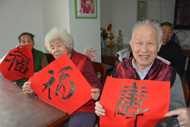 除了精彩的演出外,擅长书法的文学院志愿者们也纷纷献上自己的心意,给老人们送“福”送“寿”,祝愿他们在新的一年身体康健,寿比南山。