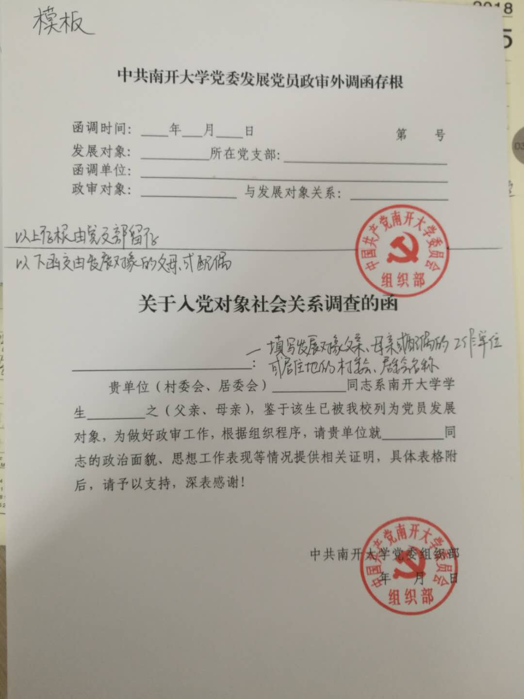 “关于入党对象社会关系调查的函”、“函调政审表格”填写模板如附件所示。