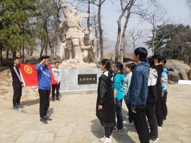 义卖活动结束后团小组来到了盘山烈士陵园。盘山烈士陵园于1959年建成,是冀东有名的烈士陵园之一。主要建筑物有烈士纪念碑、烈士墓区、烈士纪念馆和革命传统教育纪念馆。纪念碑正面碑文是由聂荣臻元帅题写的“光荣烈士永垂不朽”,烈士纪念馆内有毛泽东主席的题词和烈士遗像、传略及烈士英名录。大家穿过纪念碑廊,仔细阅读了碑文上有关当时此地抗战历史的记录。然后走过烈士纪念碑碑前甬路两侧为烈士墓区,这里安葬着205位阵亡先烈。在先烈墓前,小组成员重温了入团誓词,相比于当初入团时的宣誓,这次声音更加坚定有力、内心更加激情昂扬。