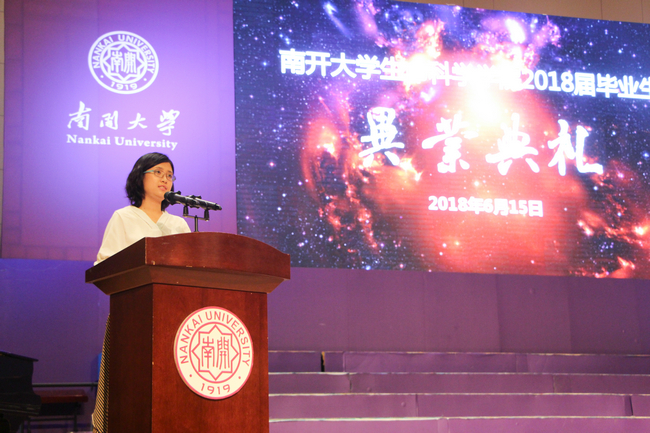 在校生代表2015级本科生刘彤上台发言。她对各位毕业生表示衷心的祝福和问候,感谢学长学姐一直以来无微不至的关心和帮助,希望大家未来能常回到生科院大家庭看看。