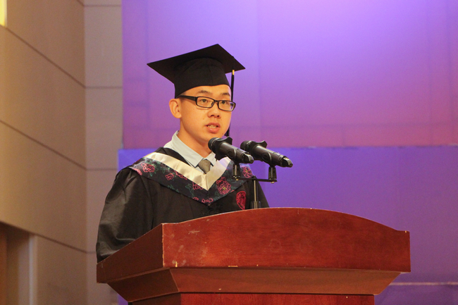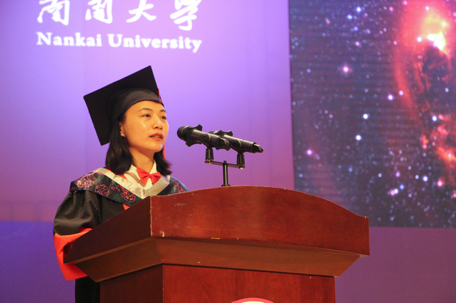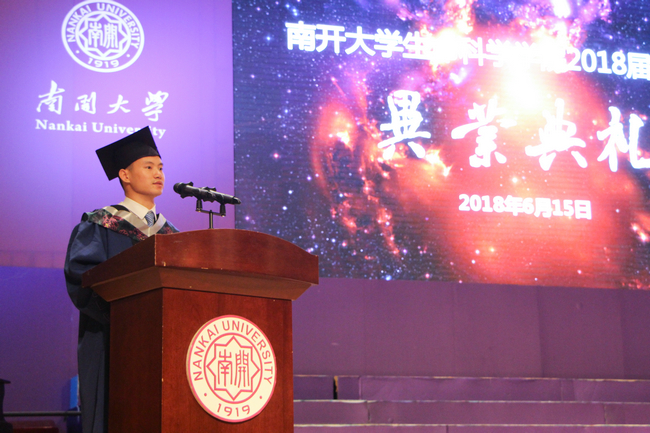 随后,程曲汉、杨祥祥、付士娟分别代表本硕博毕业生上台发言。程曲汉回忆道,自己在汶川地震之后走出四川边远山区,四年前通过国家贫困地区专项计划被南开录取,在这里接受了最好的教育,学习了如何成为对时代和社会有用的人。杨祥祥表示,自己在南开“文以治国、理以强国、商以富国”办学理念的指引下来到这所校园,通过严格的学术训练收获了科研能力与意志品格的提升。付士娟谈了自己读博过程的感悟和体会,感谢生科院优良的学风和完善的实验环境助力研究生攻克难关。她表示,未来也会继续秉持南开精神,在拼搏奋进中开创美好未来。