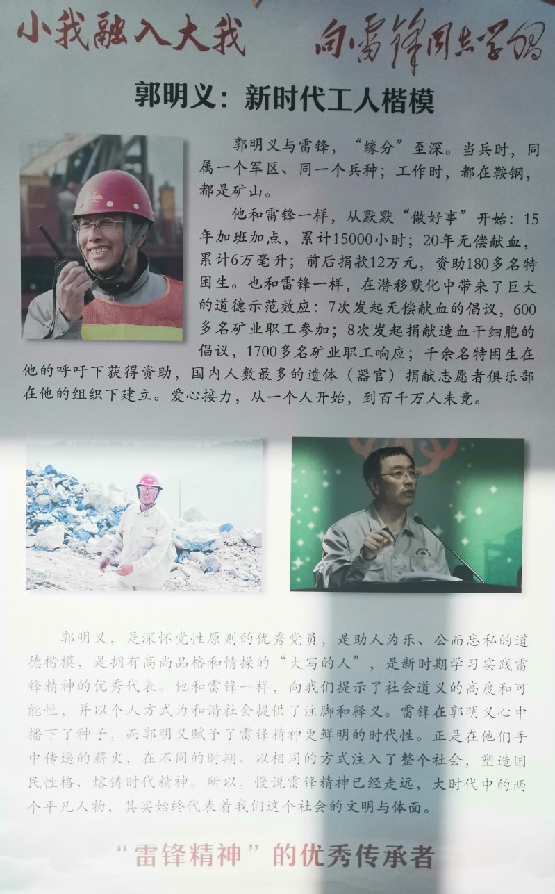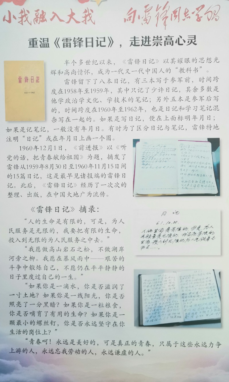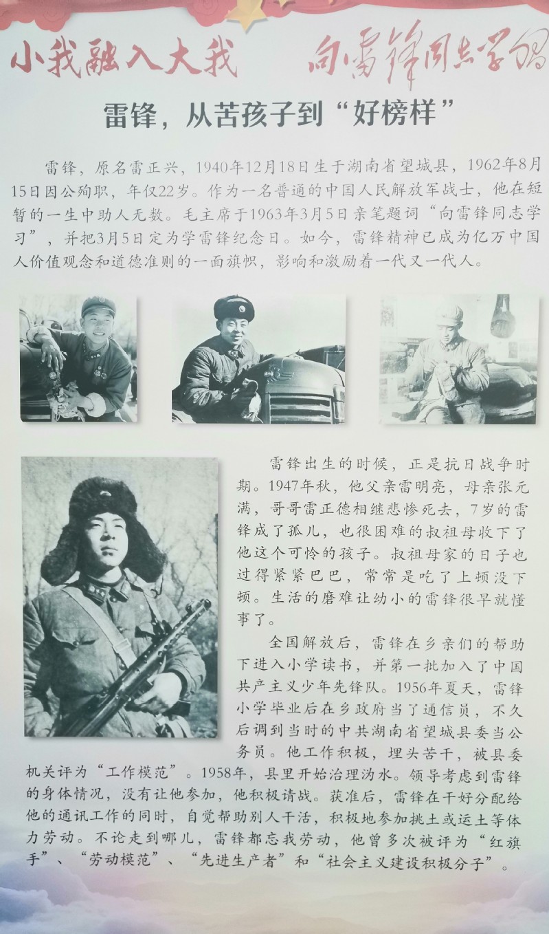 3月5日,我院在生物站一楼走廊开展了“小我融入大我,向雷锋同志学习”的主题展览。展览回顾了雷锋同志的优秀事迹,以及新时代涌现出的奉献者——工人楷模郭明义、中学教师欧珠拉明等的动人故事。