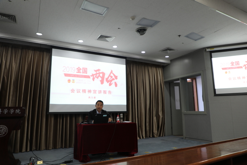 会上,高玉葆教授介绍了“两会”概况:2019年《政府工作报告》吸收涵盖了代表委员所提出的大部分意见,报告共修改了83处。两会期间,习近平总书记六下团组,发表了一系列重要讲话,充分体现了对人民群众的关心和关爱,为我们今后的工作指明了前进方向。高玉葆教授指出:这次全国两会,是在全面建成小康社会、实现第一个百年奋斗目标的关键之年召开的一次重要会议。全国两会审议通过的报告,通篇贯穿习近平新时代中国特色社会主义思想,进一步明确了国家大政方针,确定了今年工作的总体部署和重点任务。高玉葆教授为全院师生系统解读了《政府工作报告》。