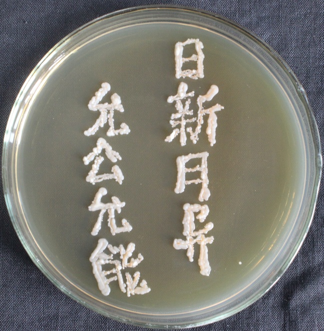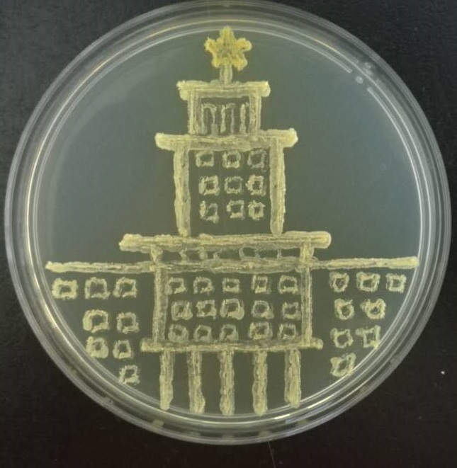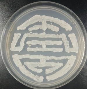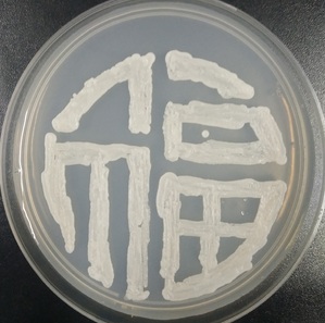 支部成员对选取的图案进行了微生物平板制作。首先对实验所需的材料进行无菌处理:将固体培养基、培养皿和竹签经过121℃高温高压湿热灭菌30分钟;然后将超净工作台用紫外灯照射30分钟灭菌,吹动过滤过的无菌风,同时燃着酒精灯形成无菌区域,从-80冰箱中取出带有不同颜色的微生物菌种放入冰盒中,利用无菌处理后的牙签蘸取菌液进行微生物平板作画。最后将画好的微生物平板放到培养箱中,静静等待微生物的生长,一两天后一幅幅美丽的作品就诞生了。