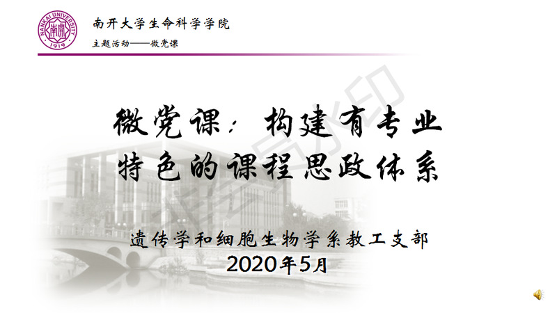 5月份,教工遗传学和细胞生物学系党支部特推出微党课——构建课程思政体系。分别由支部四位教学工作优秀的党员教师从“课程思政概况和教学实践”,“理科专业课程教学中的课程思政”,“伯苓班拔尖学生内涵思政”和“研究生教学中的课程思政”这四个方面介绍课程思政工作。借助微党课,介绍了课程思政的基本情况,针对理科专业的思政策略,还就拔尖人才和研究生的课程思政方式和内容展开讨论,对实行生物学科的课程思政拓宽思路,发挥示范引领作用。