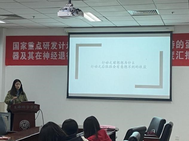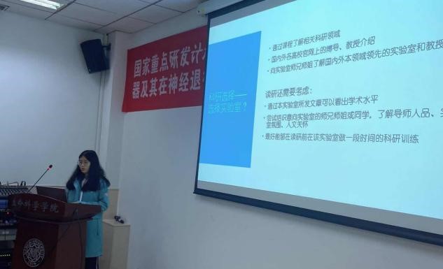 2017级生物伯苓班的孔欣同学围绕科研准备和科研选择进行了分享,让同学们更进一步了解了科研的道路。在科研准备方面,她谈到要全面学习基础学科知识、拥有良好的心理承受能力和抗压能力、提早进入感兴趣的实验室;在科研选择方面,她从是否选择科研、如何选择科研方向、如何选择实验室、如何联系导师这几个角度层层深入,系统地介绍了本科生应该如何开启科研之路。