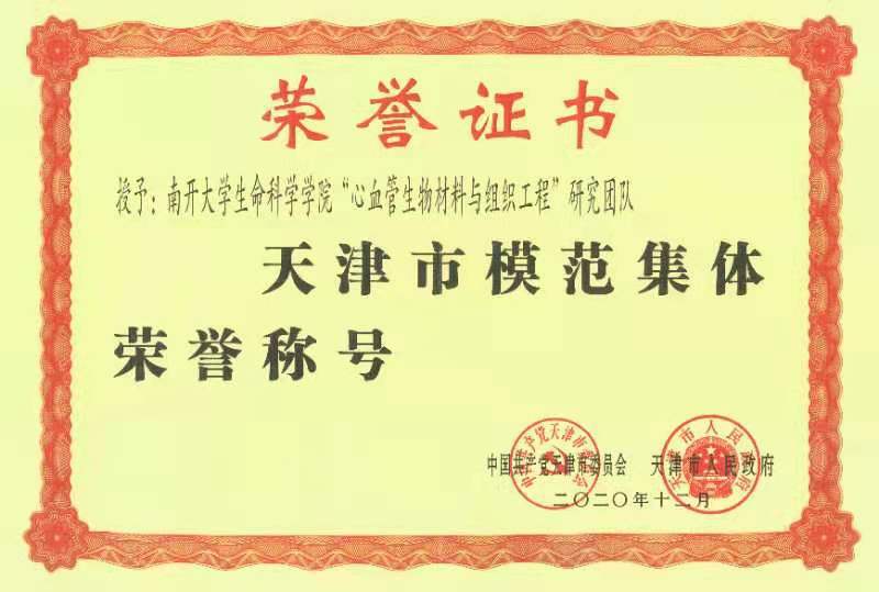 12月23日,天津市劳动模范和模范集体表彰大会在天津礼堂召开,学院“心血管生物材料与组织工程”研究团队被授予天津市模范集体荣誉称号。祝贺学院“心血管生物材料与组织工程”研究团队!