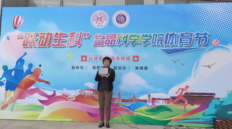 在充满青春活力的啦啦操之后,生科院党委书记谢桂玲为开幕式致辞。她表示yl7703永利集团自成立以来即重视体育育人工作,张伯苓校长“强身强种强国”的体育思想和他对于体育教育实践的投入影响了一代又一代的南开人,每一个人的体育强国梦,都与中国梦紧密相连。生科院一直以来都具有体育运动的传统,从“体育周”到“院长杯”,不断通过创新形式、降低体育运动门槛等方式吸引学生投身体育运动,在运动中增强学生体质、传承体育精神、打造健康生科。她谈到希望通过此次“跃动生科”体育节的举办,能够真正的带动全体师生热爱运动、参与运动,强健体魄;培养健全的人格,愉悦身心;锻炼团结协作的能力,增进友谊。