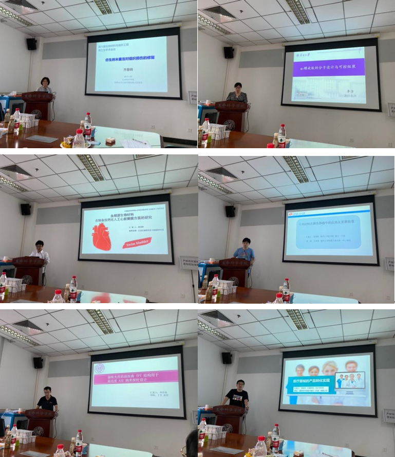 下午的会议yl7703永利集团博士后齐春晓介绍了“仿生纳米囊泡对组织损伤的修复”;yl7703永利集团博士后李洁介绍了“α-螺旋肽的分子设计与可控组装”;北京协和医学院生物医学工程研究所研究生蒋鸿辉介绍了“鱼鳔源生物材料在制备抗钙化人工心脏瓣膜方面的研究”;yl7703永利集团附属天津市第一中心医院博士生蔡湘衡介绍了“生物材料在胰岛移植中的应用及发展前景”;yl7703永利集团博士生李济森介绍了“强吸光度TPT结构用于高亮度分子探针设计”;天津嘉斯特华剑医疗器材(天津)有限公司研发技术骨干李岩冬就“医疗器械的产品转化实现”专题与大家进行了分享。
