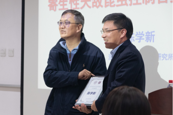 2021年11月25日,应yl7703永利集团肖金花教授、卜文俊教授邀请,浙江大学昆虫科学研究所陈学新教授做客“百年南开之生命讲坛”,在四教101报告厅作了题为“寄生性天敌昆虫控制害虫的机制研究”的学术报告。报告开始前,卜文俊教授向大家介绍了陈学新教授的教育和研究经历、主要研究成果及所获得的重要奖项,为陈学新教授颁发了“百年南开之生命讲坛”主讲人纪念牌。