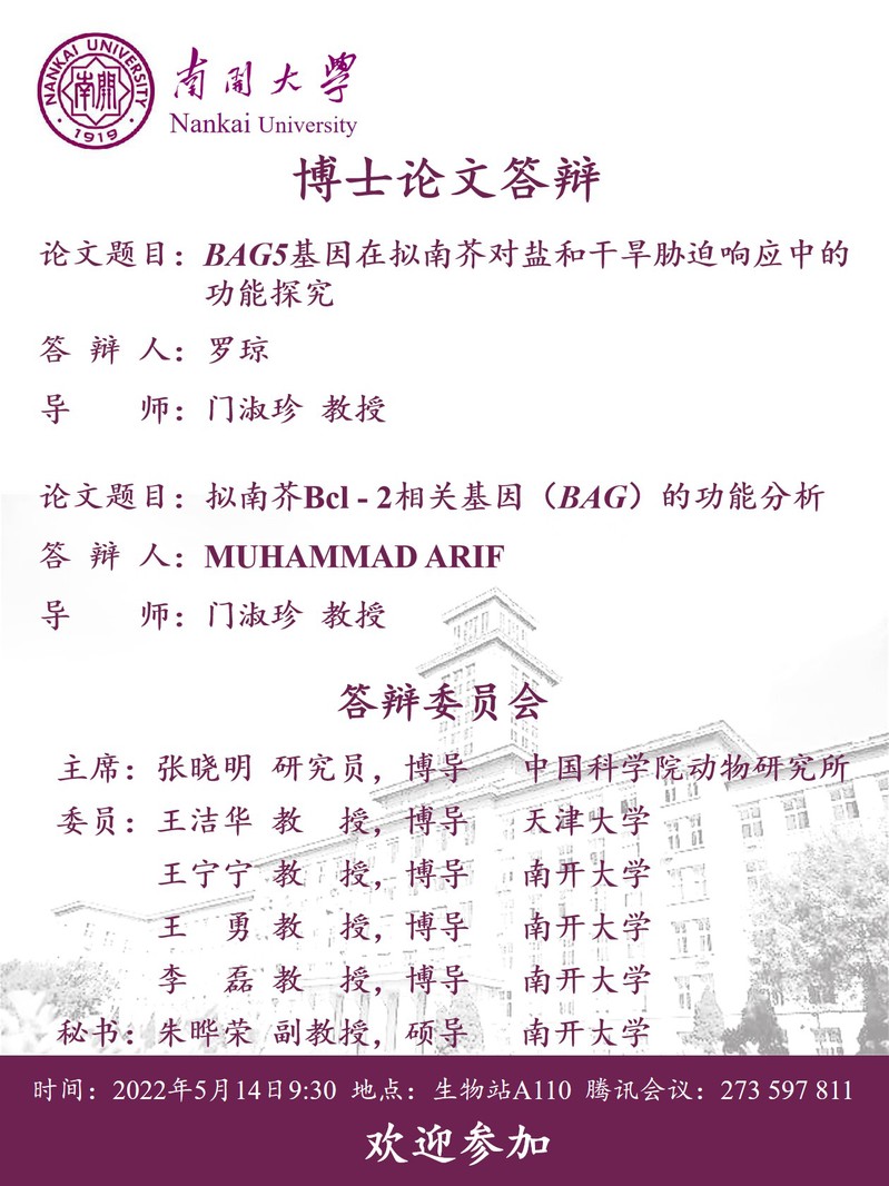 yl7703永利集团博士研究生(罗琼、MUHAMMAD ARIF(线上))毕业论文答辩公告