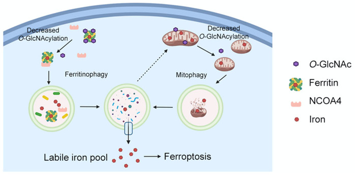 研究人员发现,O-GlcNAcylation修饰作为细胞的营养和压力感受器,在铁死亡的压力下迅速升高;若用小分子抑制剂抑制或用siRNA敲低催化O-GlcNAcylation修饰的酶阻止修饰升高,会极大促进铁死亡的进程。进一步的研究发现,抑制O-GlcNAcylation修饰可以促进铁自噬,释放出储存在铁蛋白中的铁;大量释放的铁被转运至线粒体中作为缓冲,然而,降低O-GlcNAcylation修饰后,线粒体发生破碎,并进一步发生线粒体自噬,将线粒体中的铁释放出来,促进铁死亡的进程。