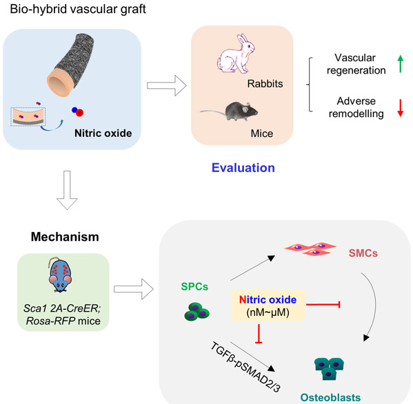 研究团队还进一步利用谱系示踪技术并结合体外细胞实验,考察了内源性血管干/祖细胞(stem/progenitor cell, SPC)在血管组织再生重构中的关键作用和调控机制。结果显示:NO通过调控SPC向血管内皮细胞方向分化并抑制其向成骨分化,从而起到促进血管再生、抑制血管钙化的作用机制。进一步研究还发现,NO对于SPC向成骨细胞分化具有双向调节作用,低浓度(nmol~μmol)NO可通过调控TGF-pSMAD2/3信号通路,抑制SPC向成骨细胞分化,进而减少血管钙化形成;而高浓度NO(mmol)则起到截然相反的作用。这些研究结果充分证明NO在调控血管干/祖细胞命运促进血管组织再生方面具有重要作用,缓释NO的生物复合型人工血管具有良好的临床转化前景。