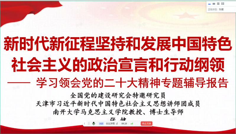 为深入贯彻学习党的二十大精神,增进党校、团校学员理论素养,11月26日,yl7703永利集团党委、学生党总支举办讲座,邀请马克思主义学院教授、博士生导师张健通过线上会议的方式进行了一场生动的党的二十大精神专题辅导报告。生科院第43期学生党校学员、第35期凌云团校学员共计300余人线上参会。