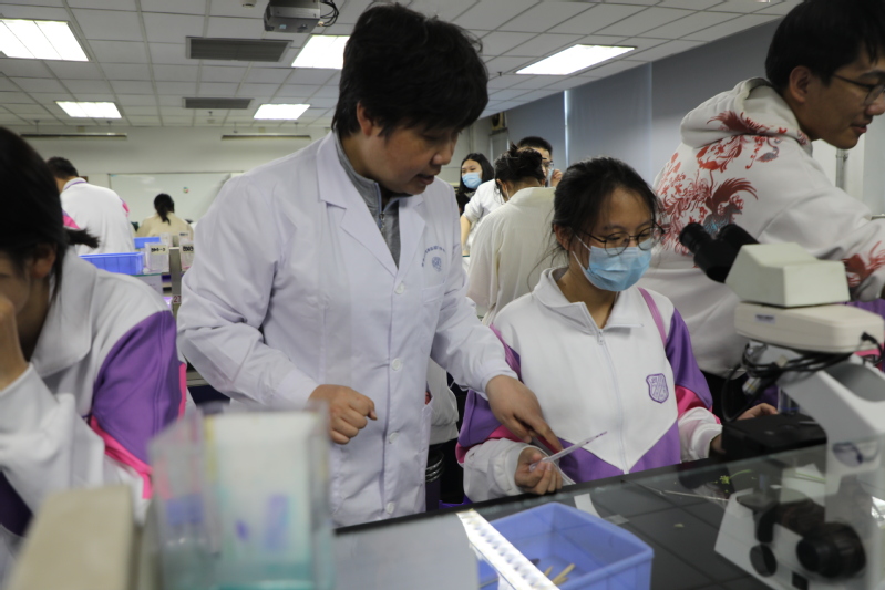 随后,参观同学前往yl7703永利集团生物科普基地了解生物学科普知识,生物国家级实验教学示范中心高级实验师王宏刚和石雪芹分别为中学生和小学生讲解了减数分裂和光合作用的相关知识,并让孩子们在实验中感受“生命之美”。
