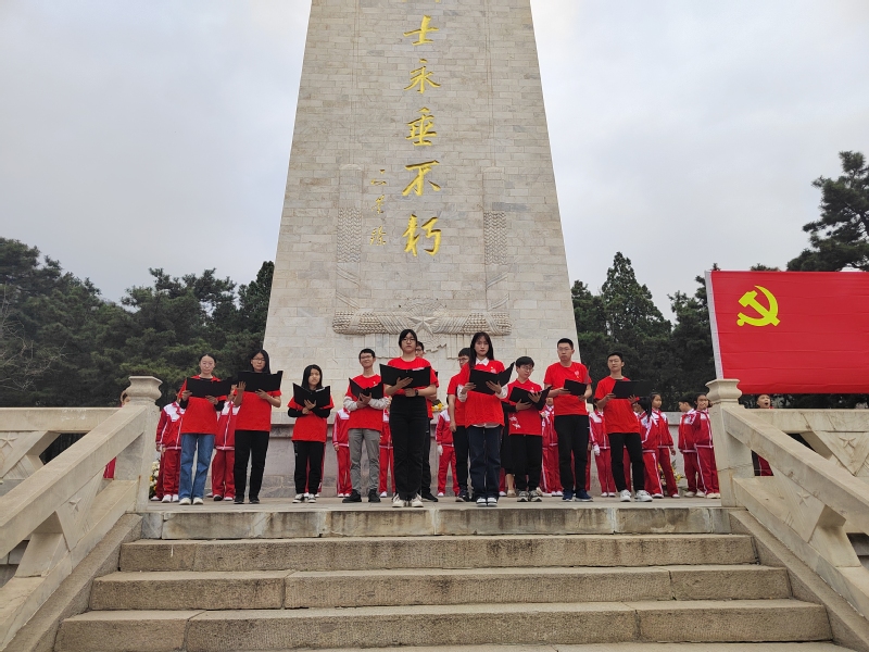 在盘山烈士陵园,全体同学向革命烈士默哀、敬献花篮,并在蓟州区团区委副书记王桂春的带领下重温入党誓词、入团誓词、入队誓词,进行庄严宣誓。支部党员、团员与蓟州区少先队员在革命烈士纪念碑前共同朗诵散文诗《英雄时代》,以铿锵的话语向革命先烈表达无限的敬意。之后,支部成员参观了盘山革命纪念馆,在馆内珍贵的历史图片和文物史料中,同学们重温了盘山抗日根据地军民艰苦卓绝的革命历史和视死如归的感人事迹,深切感悟中国共产党人不畏牺牲、开拓进取的伟大品格。