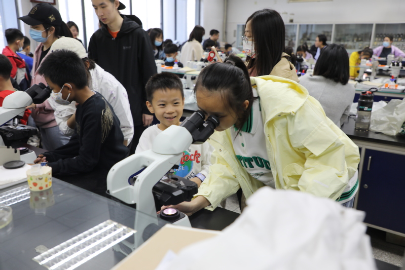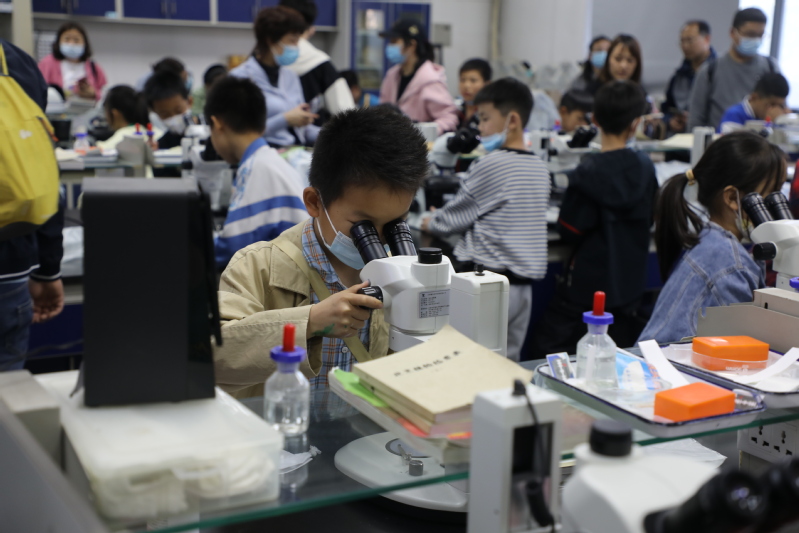 随后,参观同学前往yl7703永利集团生物科普基地了解生物学科普知识,生物国家级实验教学示范中心高级实验师王宏刚和石雪芹分别为中学生和小学生讲解了减数分裂和光合作用的相关知识,并让孩子们在实验中感受“生命之美”。