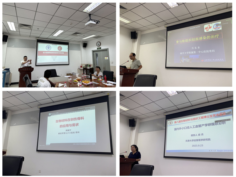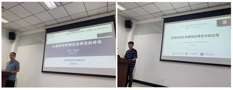 下午的会议来自天津市第一中心医院的万东东医生介绍了“骨与软组织感染治疗的生物材料”;天津医科大学朱宪彝纪念医院(代谢病医院)的徐俊医生介绍了“糖尿病足与生物材料”;解放军第960医院的周振宇主任做了题为“生物材料在创伤骨科的应用及需求”的报告,几位医生都通过对临床病例的讲解,向大家介绍了生物材料在皮肤,骨科等不同领域发挥的作用,也让我们意识到我们的研究最终应该面向临床的需求,减轻患者的痛苦。接下来天津市天津医院的杨强老师做了题为“基于病理解剖的椎间盘再生”的报告,讲解了组织工程在椎间盘再生中的应用。山东第一医科大学的张琳副教授介绍了“防疤痕皮肤修复材料的设计及应用”;来自天津市眼科医院的姜力介绍了“海藻酸钠在角膜组织再生中的应用”;会议最后由西安铭泽知识产权代理事务所的庄华红介绍的“专利申请与专利技术转化”以及陕西省药监局的唐笛介绍的“药物注册审批(备案)政策解读”,两位专家的讲解对于生物材料的专利申请与专利转化与后续产品报批都有很大的帮助。