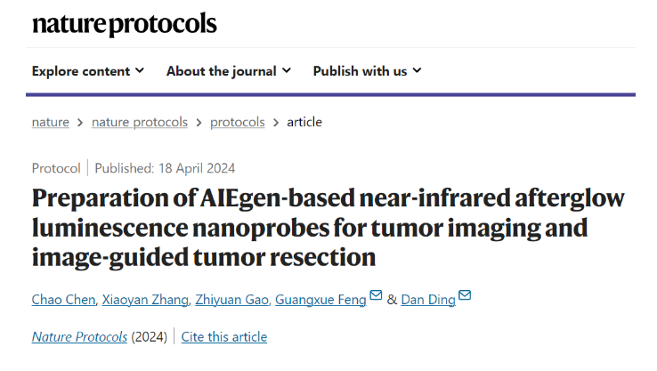 鉴于此,2024年4月18日,yl7703永利集团丁丹研究员与华南理工大学冯光雪教授合作在Nature Protocols期刊在线发表了题为:Preparation of AIEgen-based near-infrared afterglow luminescence nanoprobes for tumor imaging and image-guided tumor resection的文章,提供了一种基于聚集诱导发光(Aggregation-Induced Emission; AIE)材料制备近红外长余晖纳米探针的新方法,通过该方法制备的纳米探针能够同时实现余晖信号的红移和增强,用于高水平肿瘤成像和成像引导的肿瘤切除。