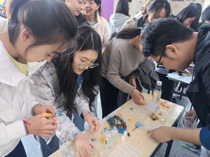 活动伊始,各项目的负责人为参与活动的同学们详细介绍了各环节的操作流程、注意事项。在引导员的帮助下,同学们有条不紊地进行各项操作。不管是对树叶进行加热、分离、塑封等操作,还是耐心等待滴胶的凝固,或是精心绘制落叶拼画,对于同学们来说都是一次充满趣味的实践体验。