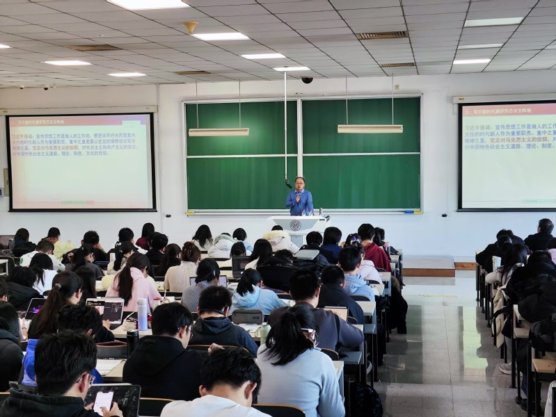 孙海东以“筑牢新时代意识形态安全阵地”为题,从“习近平文化思想”“意识形态领域遭遇的挑战”“发扬斗争精神”“筑牢意识形态安全防线”四个方面对当前意识形态斗争形势与大学生应有的担当作为进行了细致讲解。