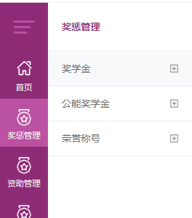 申请人登录系统后,鼠标滑动到左侧“奖惩管理”栏目,显示“奖学金”、“公能奖学金”、“荣誉称号”。如下图: